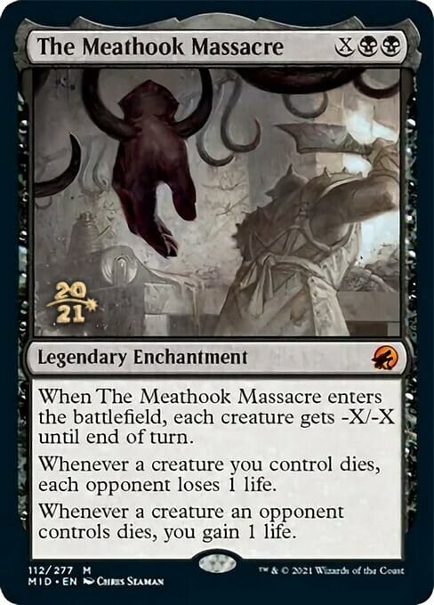 When The Meathook Massacre enters, each creature gets -X/-X until end of turn.