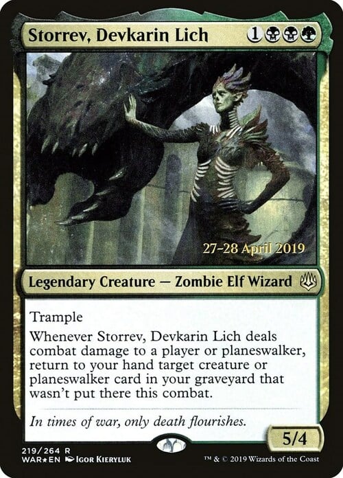 Whenever Storrev deals combat damage to a player or planeswalker, return to your hand target creature or planeswalker card in your graveyard that wasn't put there this combat.