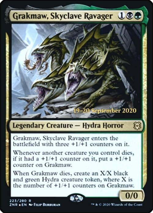 When Grakmaw dies, create an X/X black and green Hydra creature token, where X is the number of +1/+1 counters on Grakmaw.