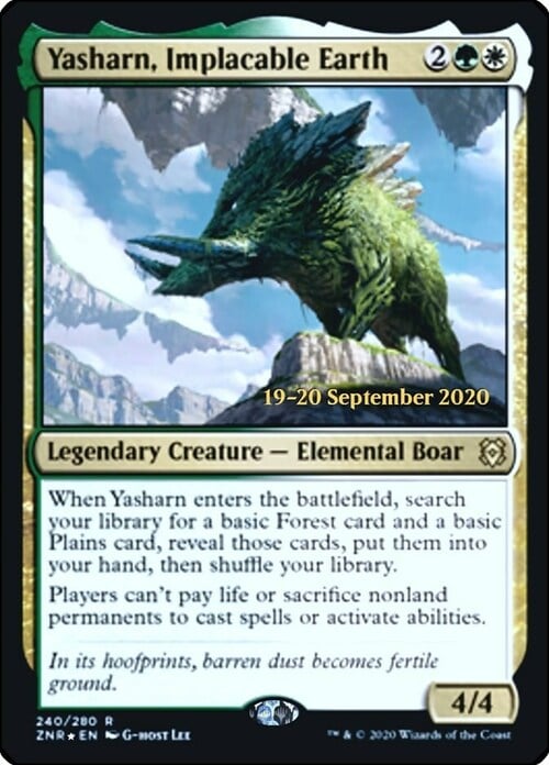 When Yasharn enters, search your library for a basic Forest card and a basic Plains card, reveal those cards, put them into your hand, then shuffle.