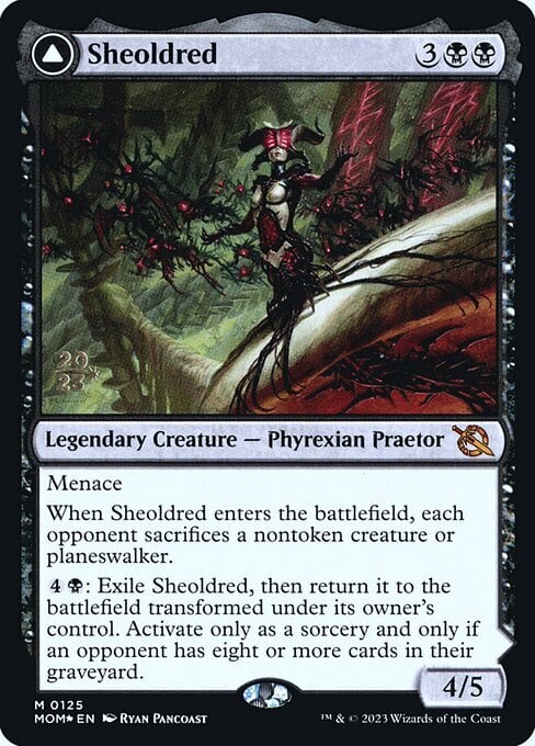 {4}{B}: Exile Sheoldred, then return it to the battlefield transformed under its owner's control. Activate only as a sorcery and only if an opponent has eight or more cards in their graveyard.