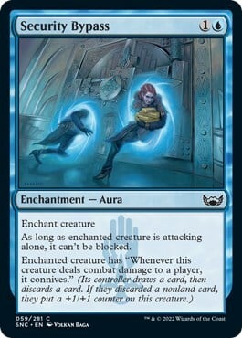 Enchanted creature has "Whenever this creature deals combat damage to a player, it connives." (Its controller draws a card, then discards a card. If they discarded a nonland card, they put a +1/+1 counter on this creature.)