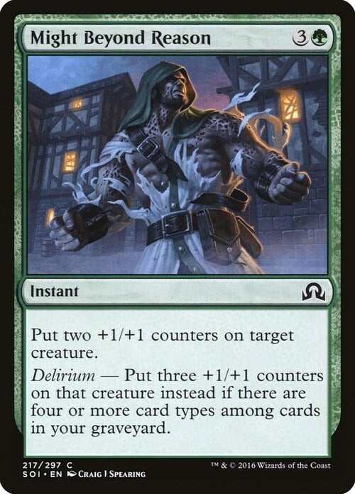 Delirium — Put three +1/+1 counters on that creature instead if there are four or more card types among cards in your graveyard.