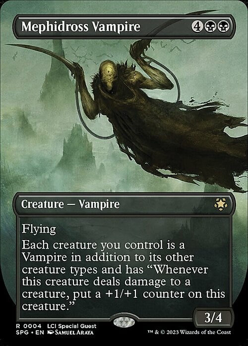 Each creature you control is a Vampire in addition to its other creature types and has "Whenever this creature deals damage to a creature, put a +1/+1 counter on this creature."