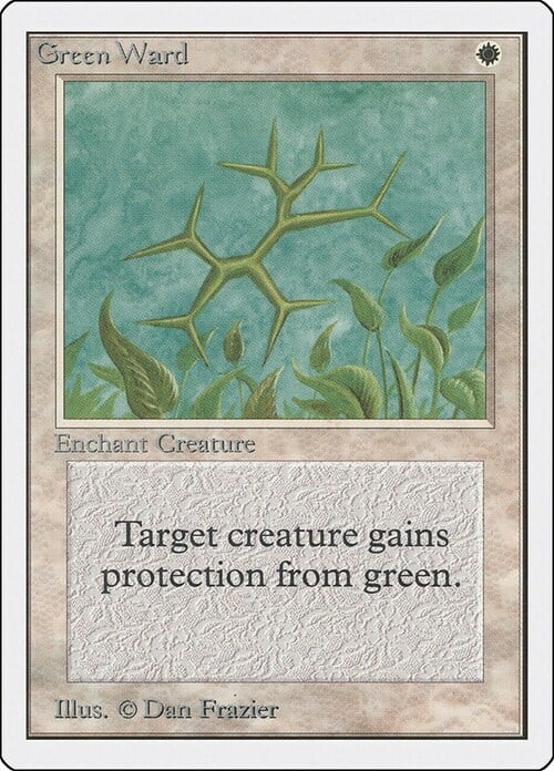 Enchanted creature has protection from green. This effect doesn't remove this Aura.