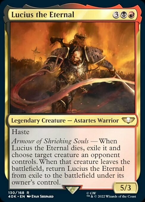 Armour of Shrieking Souls — When Lucius the Eternal dies, exile it and choose target creature an opponent controls. When that creature leaves the battlefield, return this card from exile to the battlefield under its owner's control.