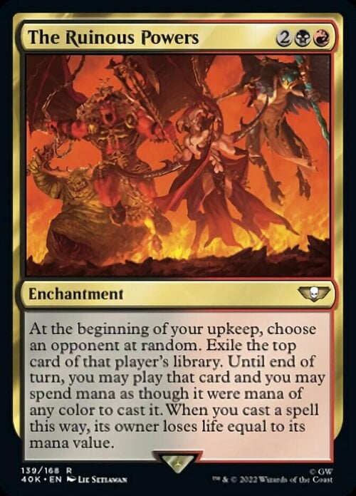 At the beginning of your upkeep, choose an opponent at random. Exile the top card of that player's library. Until end of turn, you may play that card and you may spend mana as though it were mana of any color to cast it. When you cast a spell this way, its owner loses life equal to its mana value.
