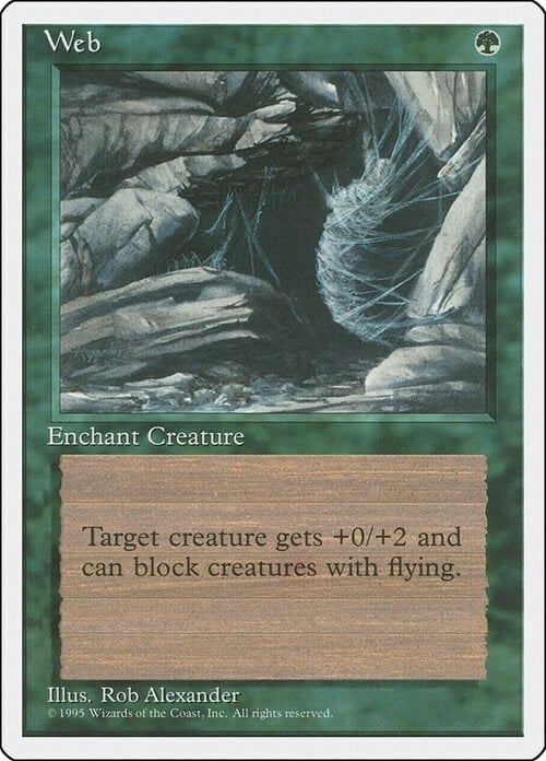 Enchanted creature gets +0/+2 and has reach. (It can block creatures with flying.)