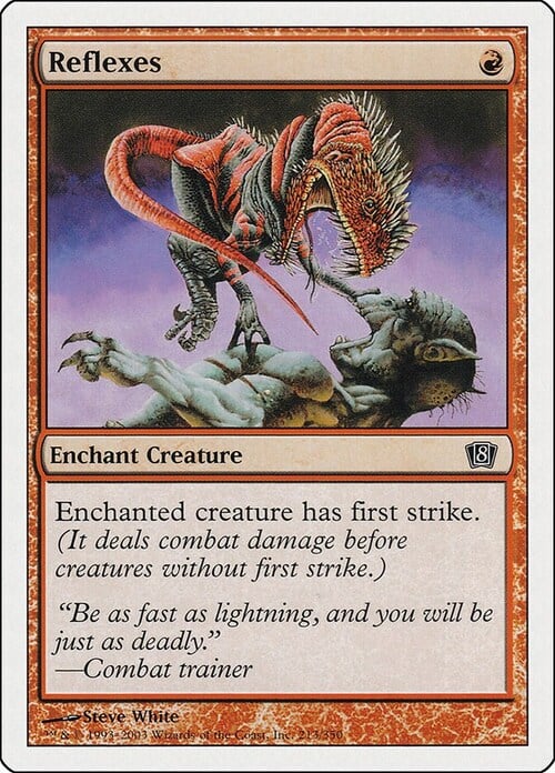 Enchanted creature has first strike. (It deals combat damage before creatures without first strike.)