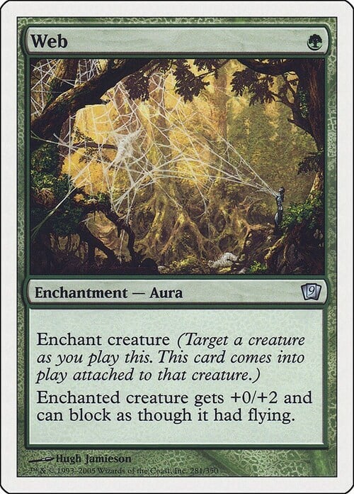 Enchanted creature gets +0/+2 and has reach. (It can block creatures with flying.)