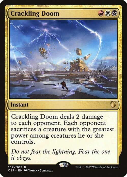 Crackling Doom deals 2 damage to each opponent. Each opponent sacrifices a creature with the greatest power among creatures that player controls.