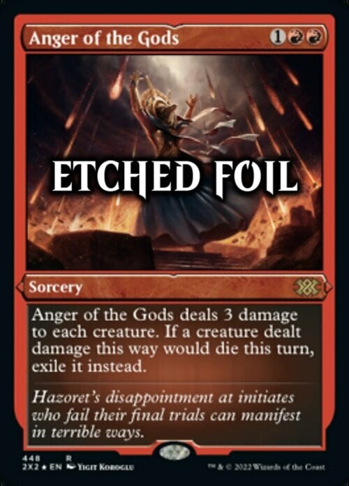 Anger of the Gods deals 3 damage to each creature. If a creature dealt damage this way would die this turn, exile it instead.