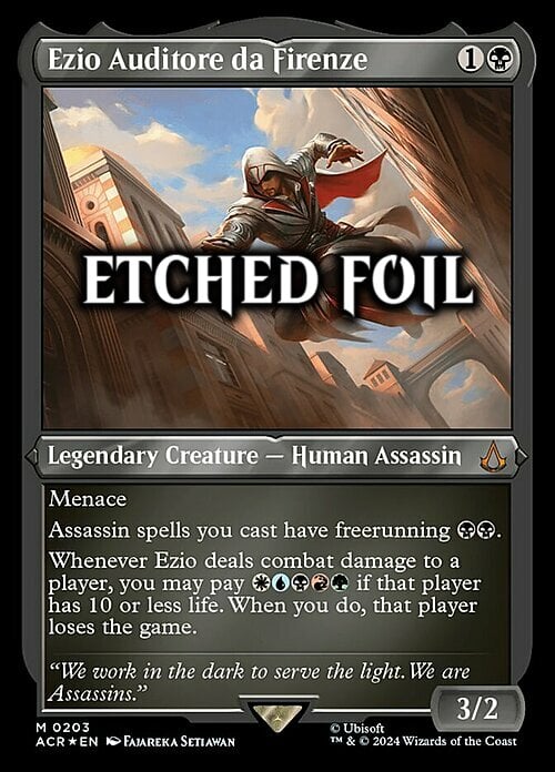 Whenever Ezio deals combat damage to a player, you may pay {W}{U}{B}{R}{G} if that player has 10 or less life. When you do, that player loses the game.