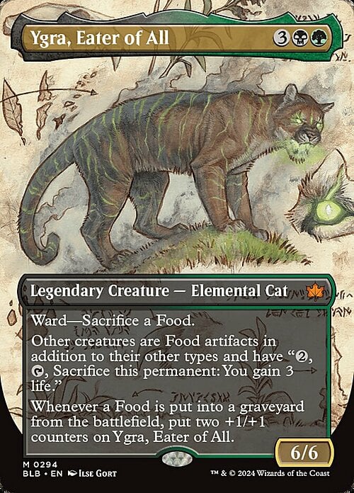 Whenever a Food is put into a graveyard from the battlefield, put two +1/+1 counters on Ygra.