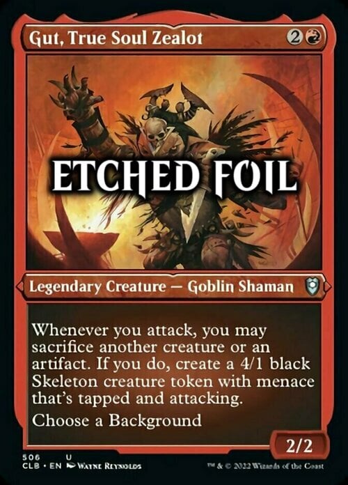 Whenever you attack, you may sacrifice another creature or an artifact. If you do, create a 4/1 black Skeleton creature token with menace that's tapped and attacking. (It can't be blocked except by two or more creatures.)
