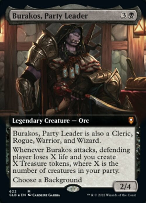 Whenever Burakos attacks, defending player loses X life and you create X Treasure tokens, where X is the number of creatures in your party.
