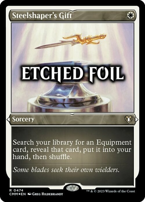 Search your library for an Equipment card, reveal that card, put it into your hand, then shuffle.