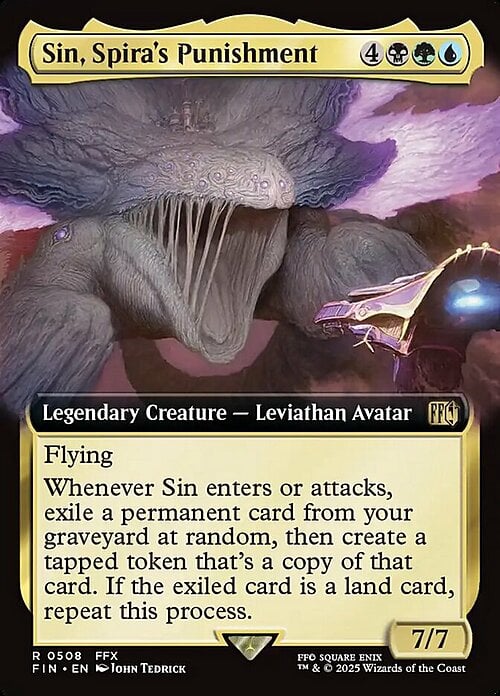 Whenever Sin enters or attacks, exile a permanent card from your graveyard at random, then create a tapped token that's a copy of that card. If the exiled card is a land card, repeat this process.