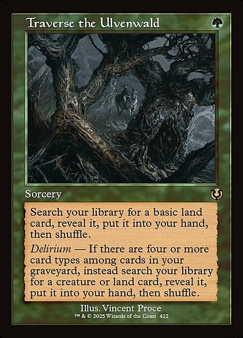 Delirium — If there are four or more card types among cards in your graveyard, instead search your library for a creature or land card, reveal it, put it into your hand, then shuffle.