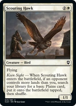 Keen Sight — When this creature enters, if an opponent controls more lands than you, search your library for a basic Plains card, put it onto the battlefield tapped, then shuffle.