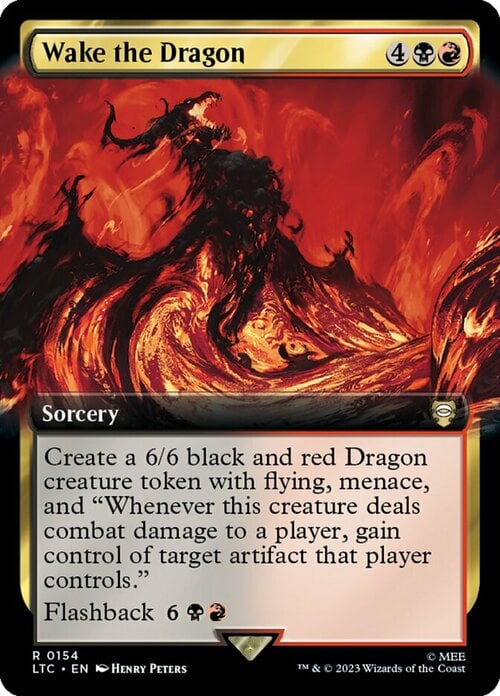 Create a 6/6 black and red Dragon creature token with flying, menace, and "Whenever this token deals combat damage to a player, gain control of target artifact that player controls."