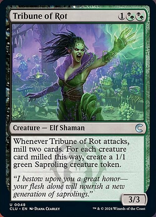 Whenever this creature attacks, mill two cards. For each creature card milled this way, create a 1/1 green Saproling creature token.