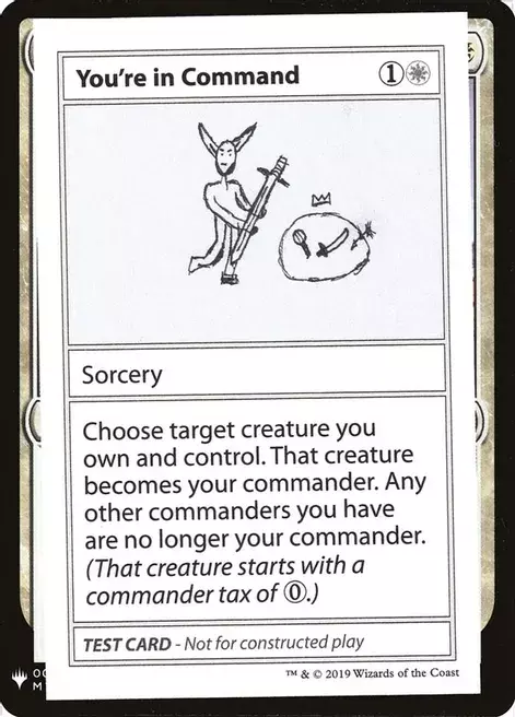 Choose target creature you own and control. That creature becomes your commander. Any other commanders you have are no longer your commander. (That creature starts with a commander tax of {0}.)