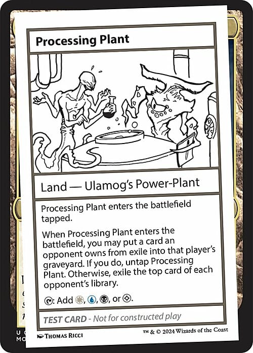 When Processing Plant enters the battlefield, you may put a card an opponent owns from exile into that player's graveyard. If you do, untap Processing Plant. Otherwise, exile the top card of each opponent's library.