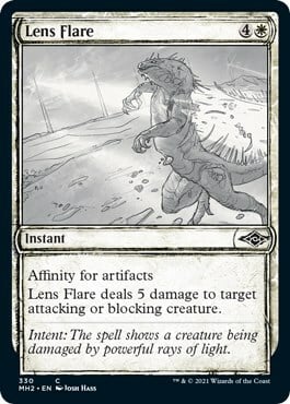 Lens Flare deals 5 damage to target attacking or blocking creature.