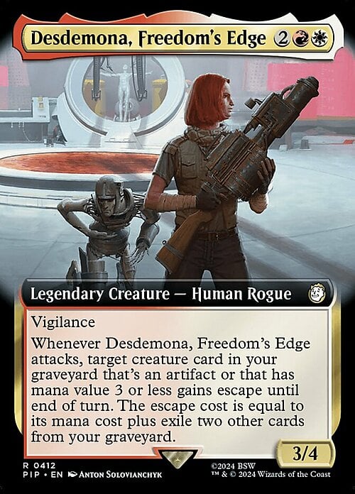 Whenever Desdemona attacks, target creature card in your graveyard that's an artifact or that has mana value 3 or less gains escape until end of turn. The escape cost is equal to its mana cost plus exile two other cards from your graveyard. (You may cast it from your graveyard for its escape cost this turn.)