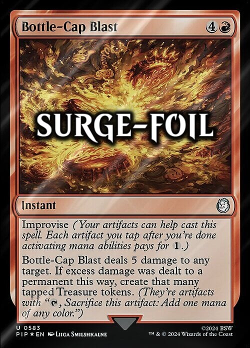 Bottle-Cap Blast deals 5 damage to any target. If excess damage was dealt to a permanent this way, create that many tapped Treasure tokens. (They're artifacts with "{T}, Sacrifice this token: Add one mana of any color.")