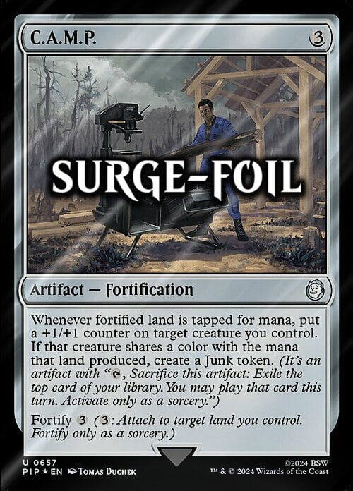 Whenever fortified land is tapped for mana, put a +1/+1 counter on target creature you control. If that creature shares a color with the mana that land produced, create a Junk token. (It's an artifact with "{T}, Sacrifice this token: Exile the top card of your library. You may play that card this turn. Activate only as a sorcery.")