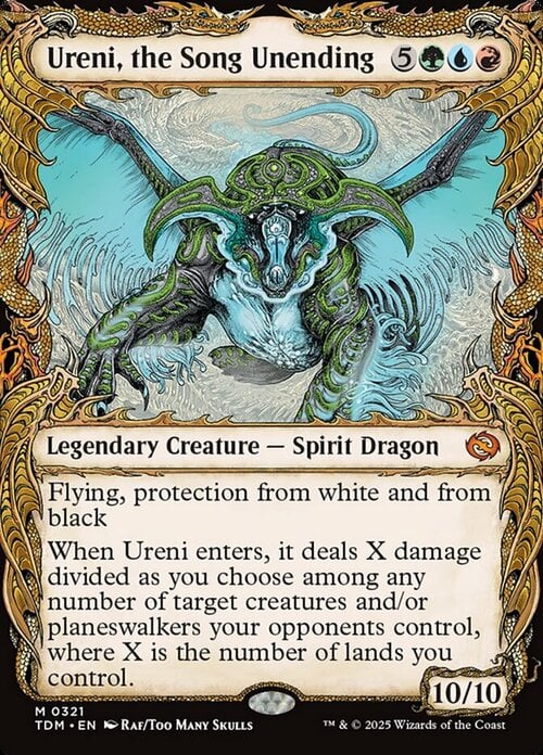When Ureni enters, it deals X damage divided as you choose among any number of target creatures and/or planeswalkers your opponents control, where X is the number of lands you control.