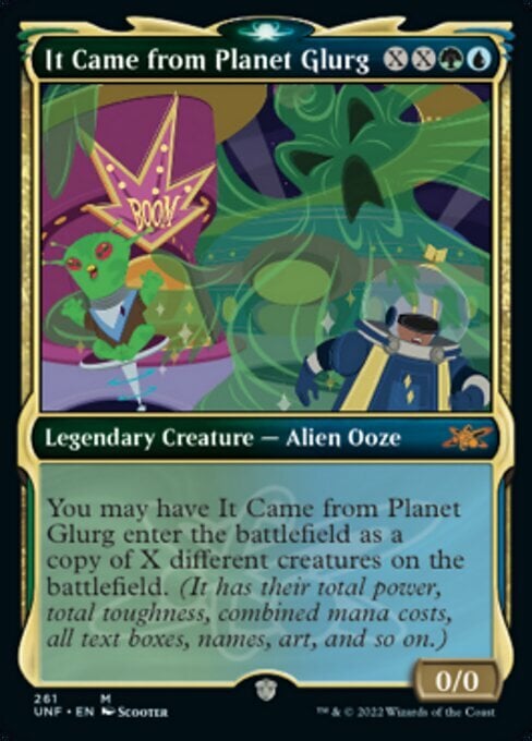 You may have It Came from Planet Glurg enter as a copy of X different creatures on the battlefield. (It has their total power, total toughness, combined mana costs, all text boxes, names, art, and so on.)