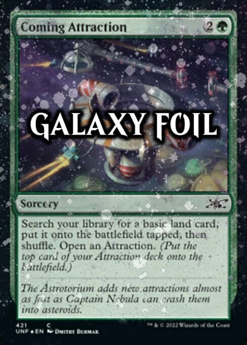 Search your library for a basic land card, put it onto the battlefield tapped, then shuffle. Open an Attraction. (Put the top card of your Attraction deck onto the battlefield.)