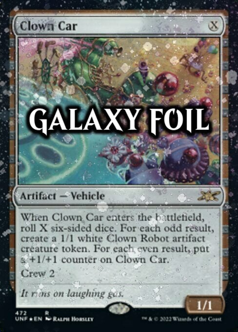 When this Vehicle enters, roll X six-sided dice. For each odd result, create a 1/1 white Clown Robot artifact creature token. For each even result, put a +1/+1 counter on this Vehicle.