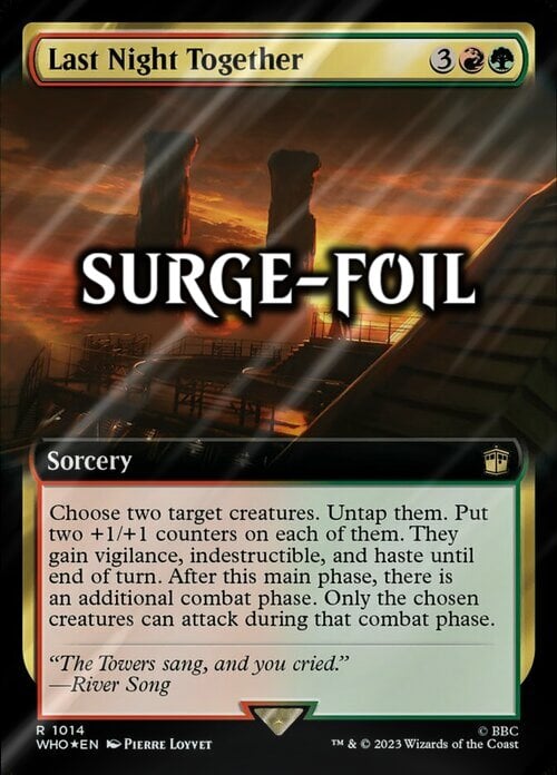 Choose two target creatures. Untap them. Put two +1/+1 counters on each of them. They gain vigilance, indestructible, and haste until end of turn. After this main phase, there is an additional combat phase. Only the chosen creatures can attack during that combat phase.