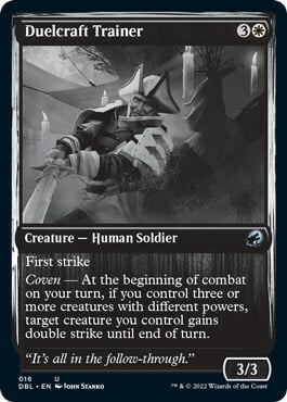 Coven — At the beginning of combat on your turn, if you control three or more creatures with different powers, target creature you control gains double strike until end of turn.