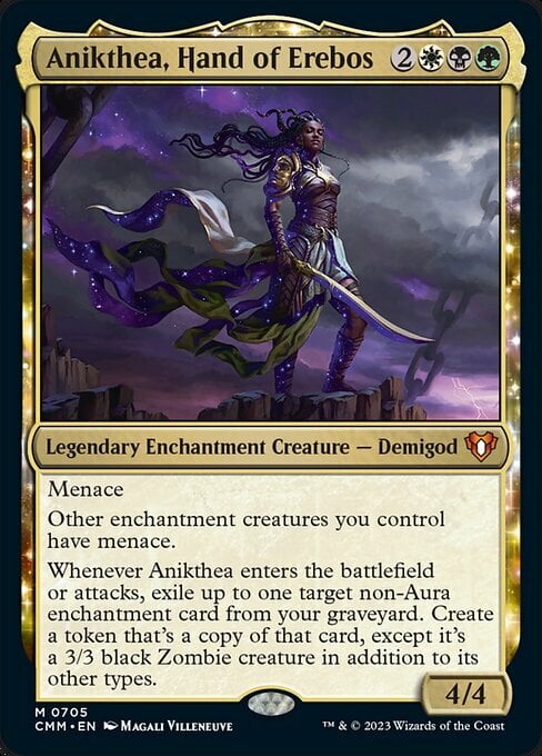 Whenever Anikthea enters or attacks, exile up to one target non-Aura enchantment card from your graveyard. Create a token that's a copy of that card, except it's a 3/3 black Zombie creature in addition to its other types.