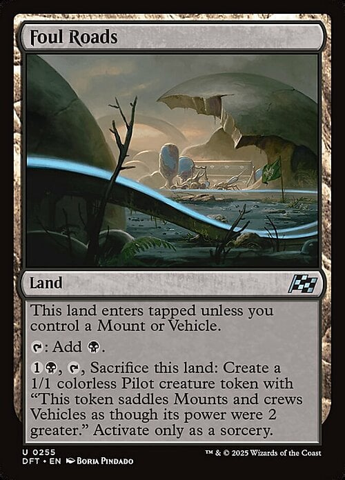 {1}{B}, {T}, Sacrifice this land: Create a 1/1 colorless Pilot creature token with "This token saddles Mounts and crews Vehicles as though its power were 2 greater." Activate only as a sorcery.