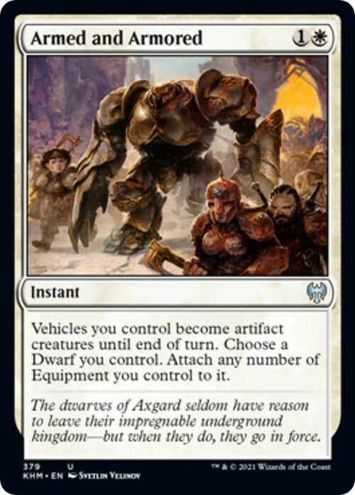 Vehicles you control become artifact creatures until end of turn. Choose a Dwarf you control. Attach any number of Equipment you control to it.