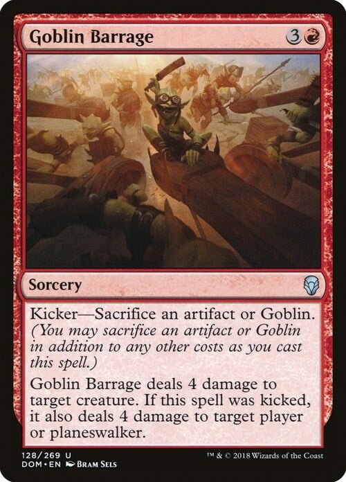 Goblin Barrage deals 4 damage to target creature. If this spell was kicked, it also deals 4 damage to target player or planeswalker.