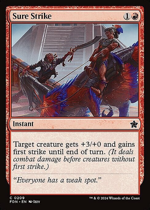Target creature gets +3/+0 and gains first strike until end of turn. (It deals combat damage before creatures without first strike.)