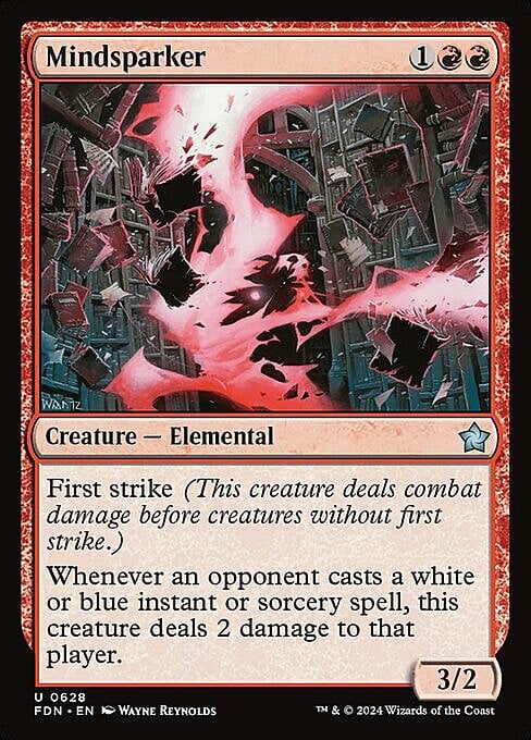 Whenever an opponent casts a white or blue instant or sorcery spell, this creature deals 2 damage to that player.