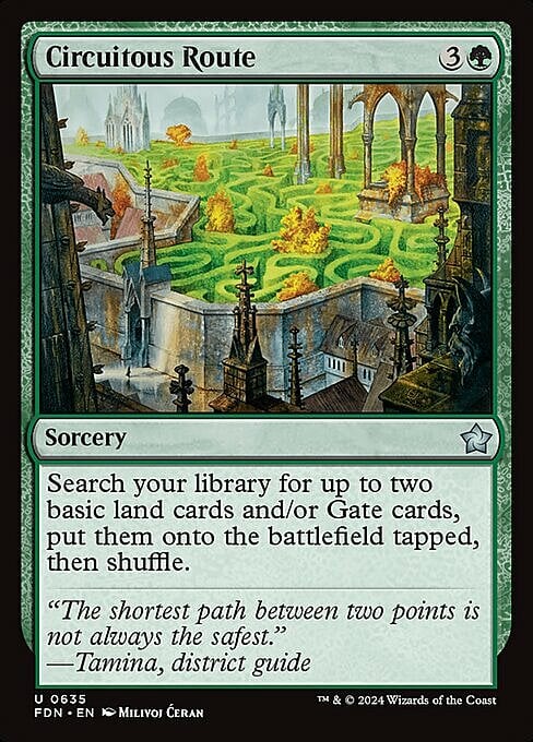 Search your library for up to two basic land cards and/or Gate cards, put them onto the battlefield tapped, then shuffle.
