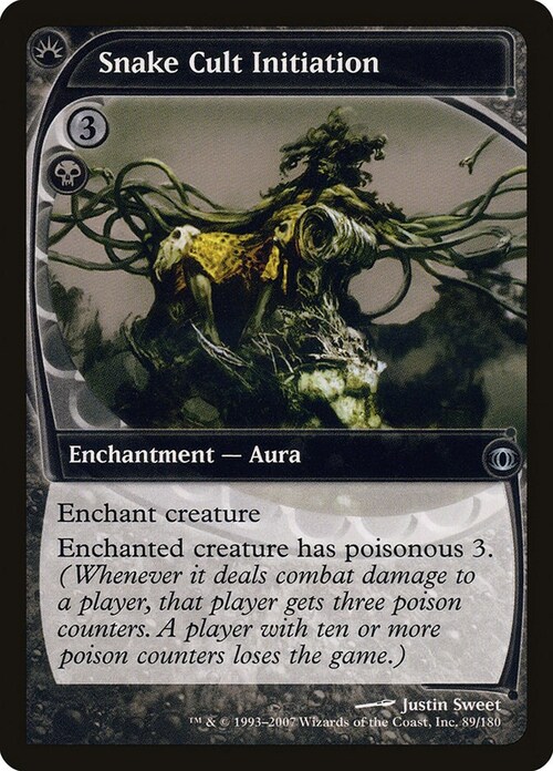 Enchanted creature has poisonous 3. (Whenever it deals combat damage to a player, that player gets three poison counters. A player with ten or more poison counters loses the game.)