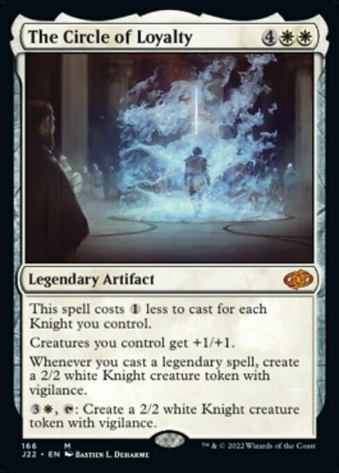 Whenever you cast a legendary spell, create a 2/2 white Knight creature token with vigilance.