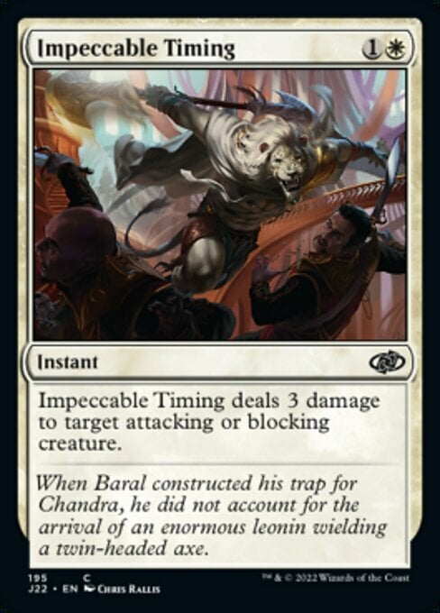 Impeccable Timing deals 3 damage to target attacking or blocking creature.