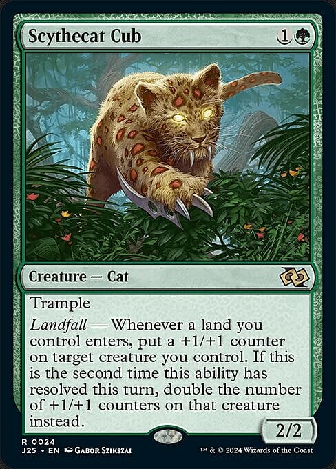 Landfall — Whenever a land you control enters, put a +1/+1 counter on target creature you control. If this is the second time this ability has resolved this turn, double the number of +1/+1 counters on that creature instead.