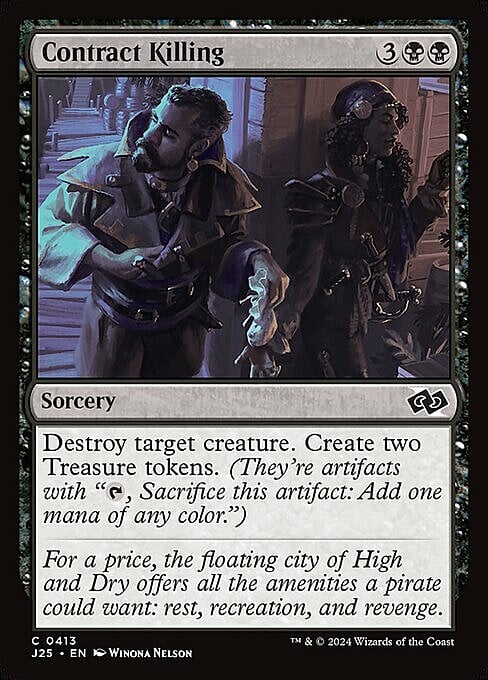 Destroy target creature. Create two Treasure tokens. (They're artifacts with "{T}, Sacrifice this token: Add one mana of any color.")